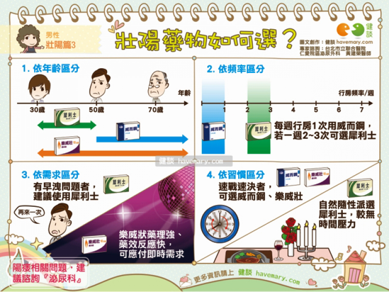 1. 以年齡層區分-若為50歲以上慢性病好發族群,建議可選擇威而鋼,若為30至50的年輕族群,可選擇長效性的犀利士,年長者反而不建議使用犀利士,以免造成健康疑慮;而樂威壯則不限年齡使用。