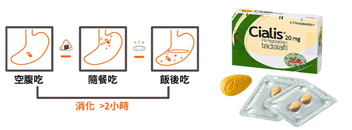 | 午餐後突然有性行為機會 | 按需型20mg | 餐後至少等1小時再吃 | 高油脂延遲吸收 |