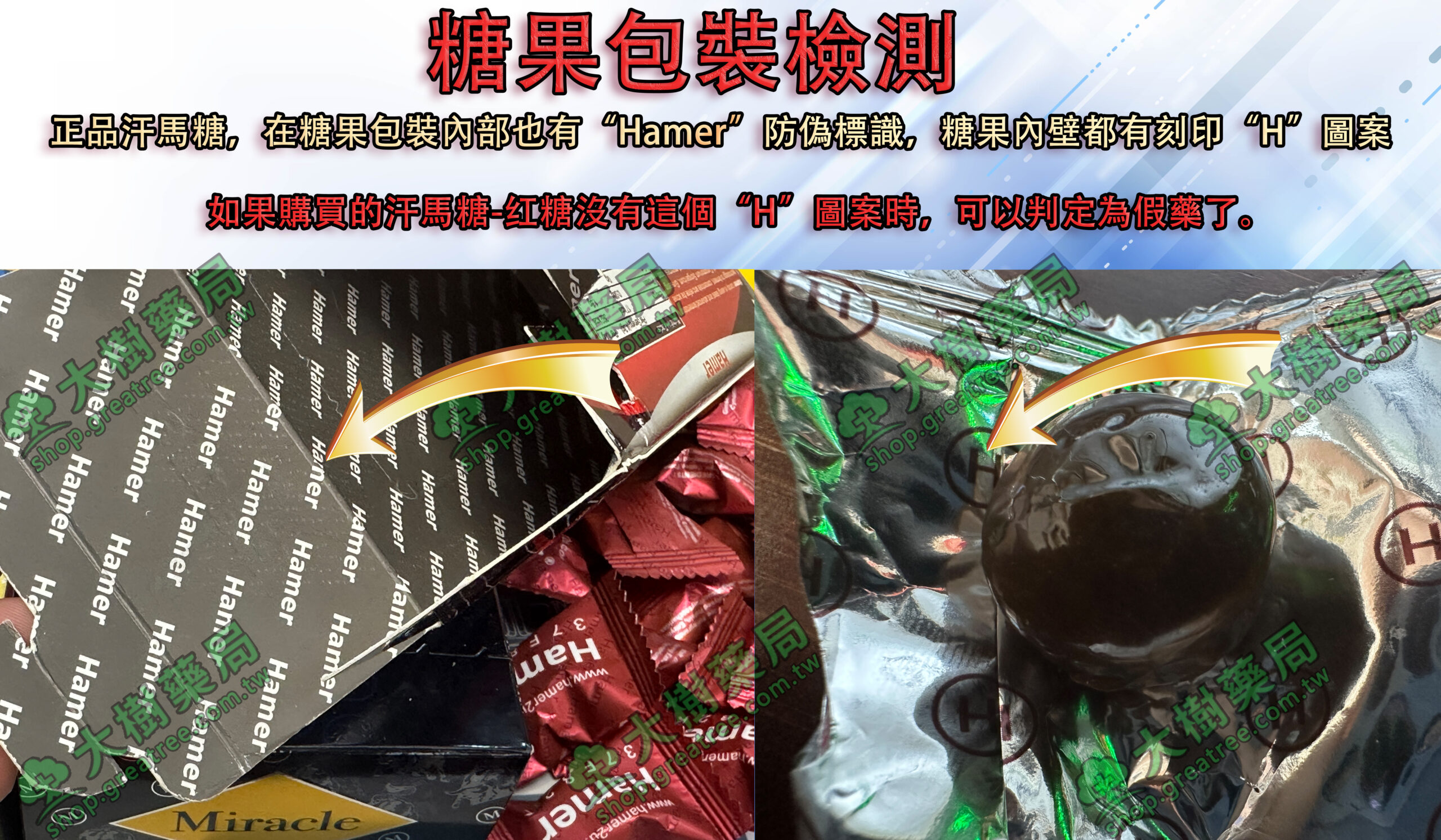 汗馬糖的包裝內部也是大有玄機哦,為防假冒仿冒,在糖果包裝內部也有防偽標識,包裝內壁有刻印“H”圖案,朋友們買到手汗馬糖後也可以確認下你們的包裝中有無“H”圖案哦。所以您如果購買的汗馬糖沒有這個圖案時,可以判定為假藥了。