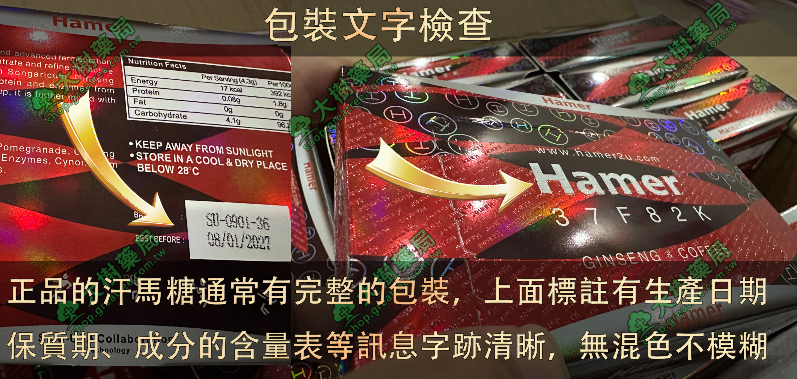 原廠正品的汗馬糖通常有完整的包裝,上面標註有生產日期、保質期、成分的含量表等訊息,假冒產品的包裝可能較為簡陋或信息不全。