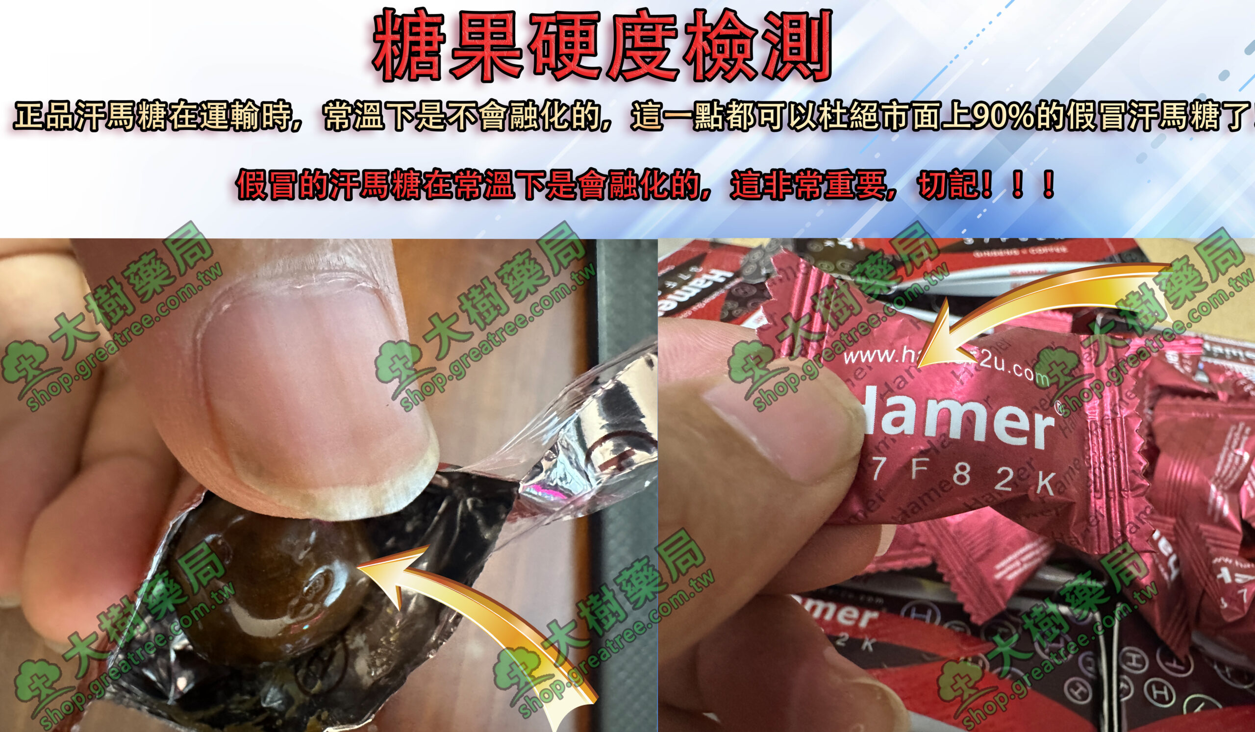 假冒的汗馬糖在常溫下是會融化的,這非常重要,切記!!!