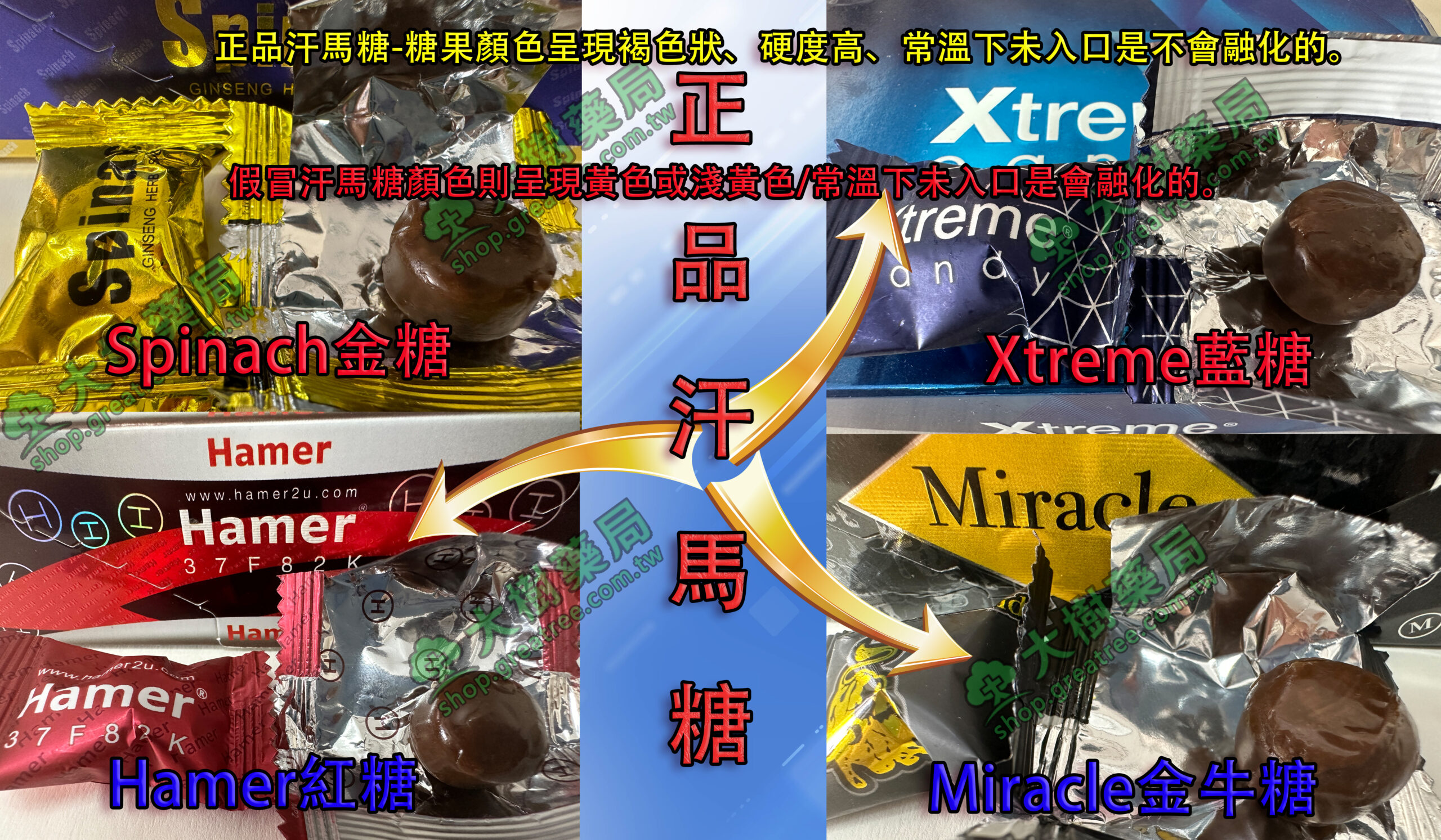 - 正品糖果顏色呈現褐色狀、硬度高、常溫下未入口是不會融化的。(含化),原廠的汗馬糖在運輸時都不會融化的。