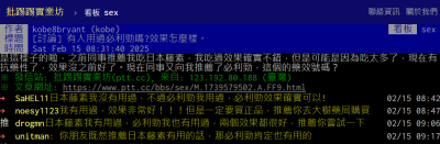 在PTT的sex版、boy-girl版及medic版,許多使用者分享了服用必利勁的心得: