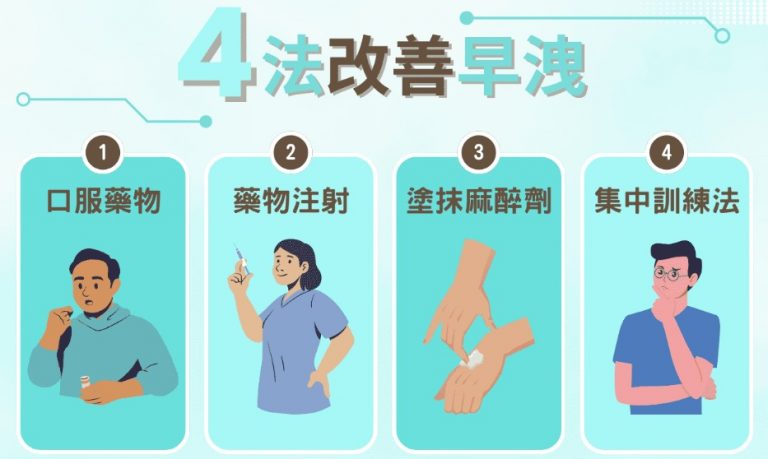 - 醫師建議先使用必利勁(Dapoxetine)控制射精,再搭配心理諮商。