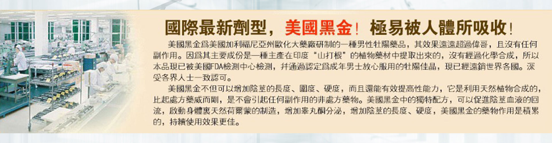 | 美國加利福尼亞州歐化大藥廠研製品質穩定可靠 | 美國黑金為美國加利福尼亞州歐化大 藥廠研製的男性壯陽藥品,主要成份是由山打根的植物藥材中提取出來的,沒有經過化學合成,產品已被美國FDA檢測中心檢查,通過認定為成年男士放心服用的壯陽佳品。 |