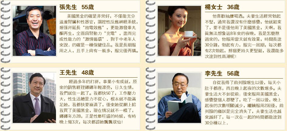 美國黑金不會產生任何副作用及依賴性,沒有臉紅、心跳加速、頭痛等反應,而且不受心臟病,高血壓及糖尿病的影響,對前列腺患者有良好的療效,酒後服用不影響效果。