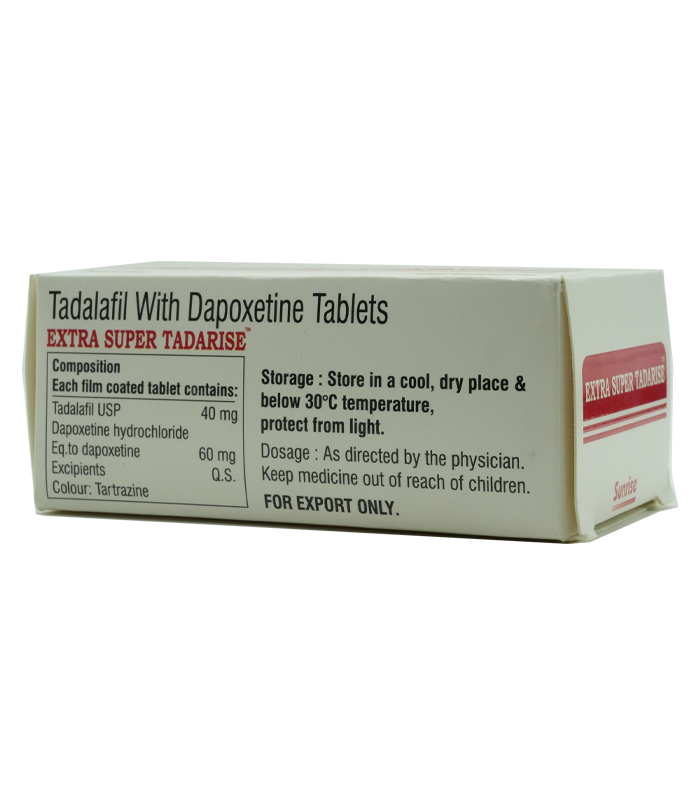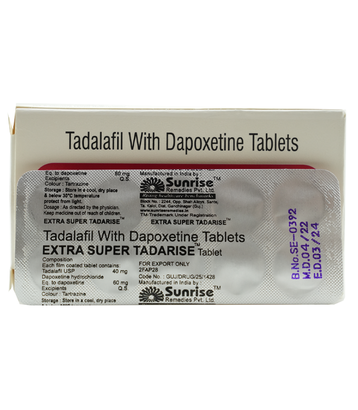 Super Tadarise印度雙效犀利士是一種強大的藥物,逐漸成為台灣眾多男士的認可和青睞,它的效果非常顯著,可以幫助男性治療陽痿和早洩。 印度Super Tadarise雙效犀利士成份為他達拉非與達泊西汀。每1粒SUPER TADARISE超級雙效犀利士包含他達拉非40mg(1粒犀利士)+ 達泊西汀60mg,具有助勃與延時雙重功效。因其效果非常猛,建議房事提前1-3小時服用,並且配一大杯溫開水。