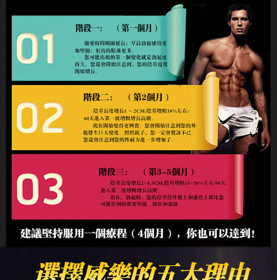 3、新鮮優質的原料:正確的配方,優質的原料,新鮮天然的成分,才能發揮最好的效果,提升男性的自尊、自信和生活質量。