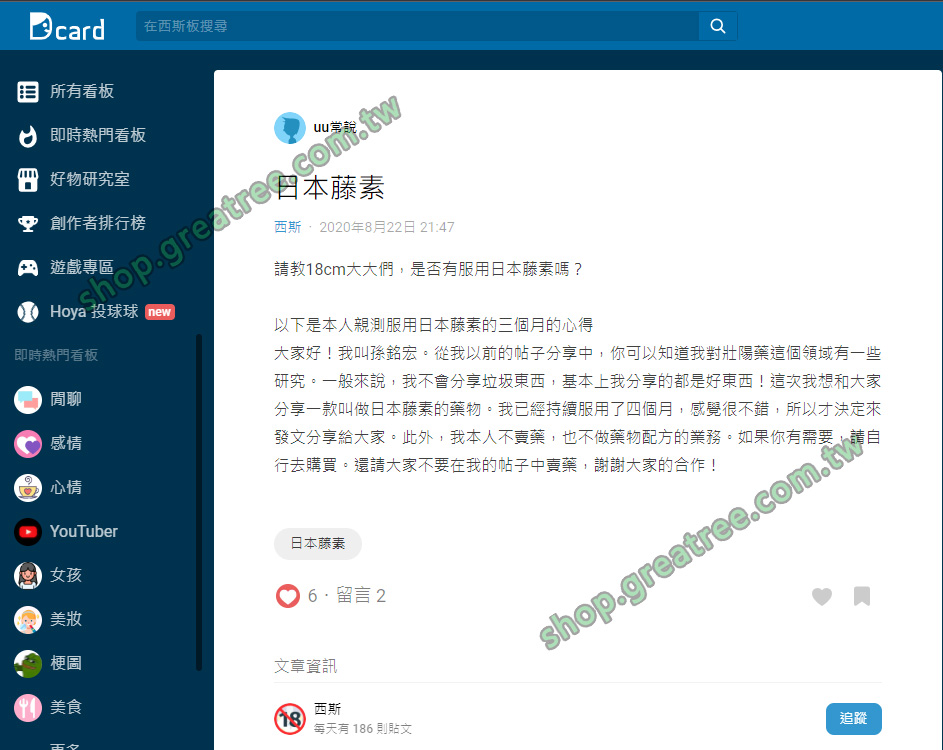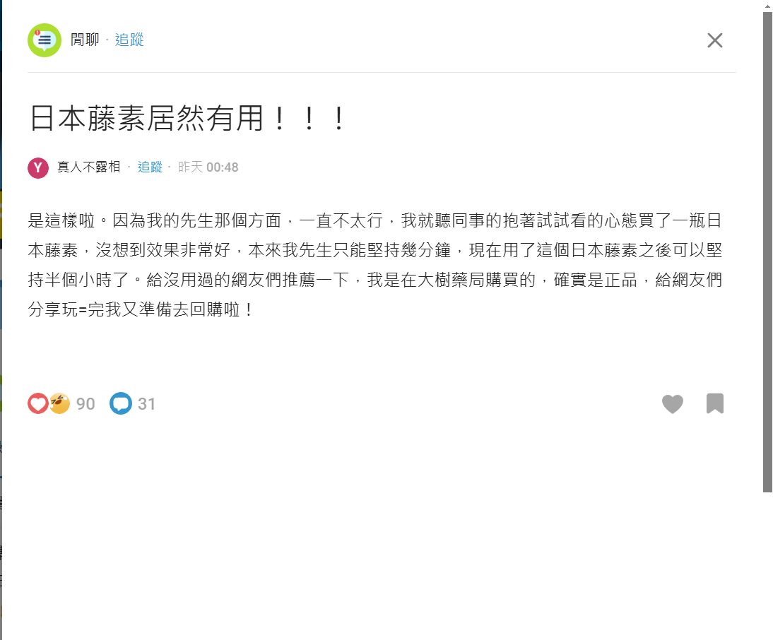 - 案例1:25歲學生因早洩被分手,服用日本藤素3個月重拾信心,現任女友Dcard發文:「終於體驗到高潮!」